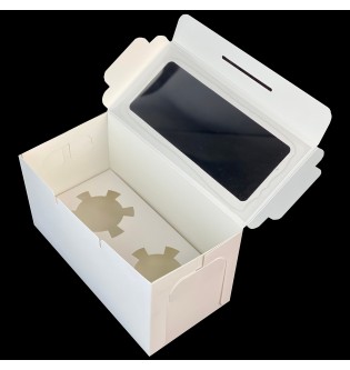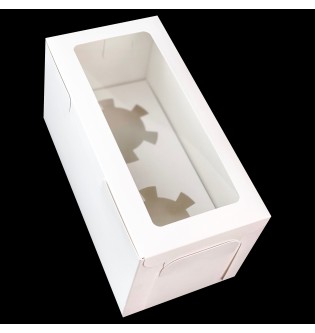 Bardzo eleganckie, jednoczęściowe opakowanie na muffiny, wykonane z wysokiej jakości białego i sztywnego kartonu o gramaturze 300g/m2, co sprawia że pudełko jest stabilne, nie deformuje się i nie gniecie. Łatwe i szybkie składanie. Pudełko posiada okienko ze sztywnej folii, które doskonale eksponuje wyroby cukiernicze. Produkt wykonany z materiału posiadającego atest do kontaktu z żywnością. Wkładka posiada regulowane otwory, dzięki czemu można w nich umieścić muffiny o różnych gabarytach bez obawy, że będą wypadać podczas transportu.