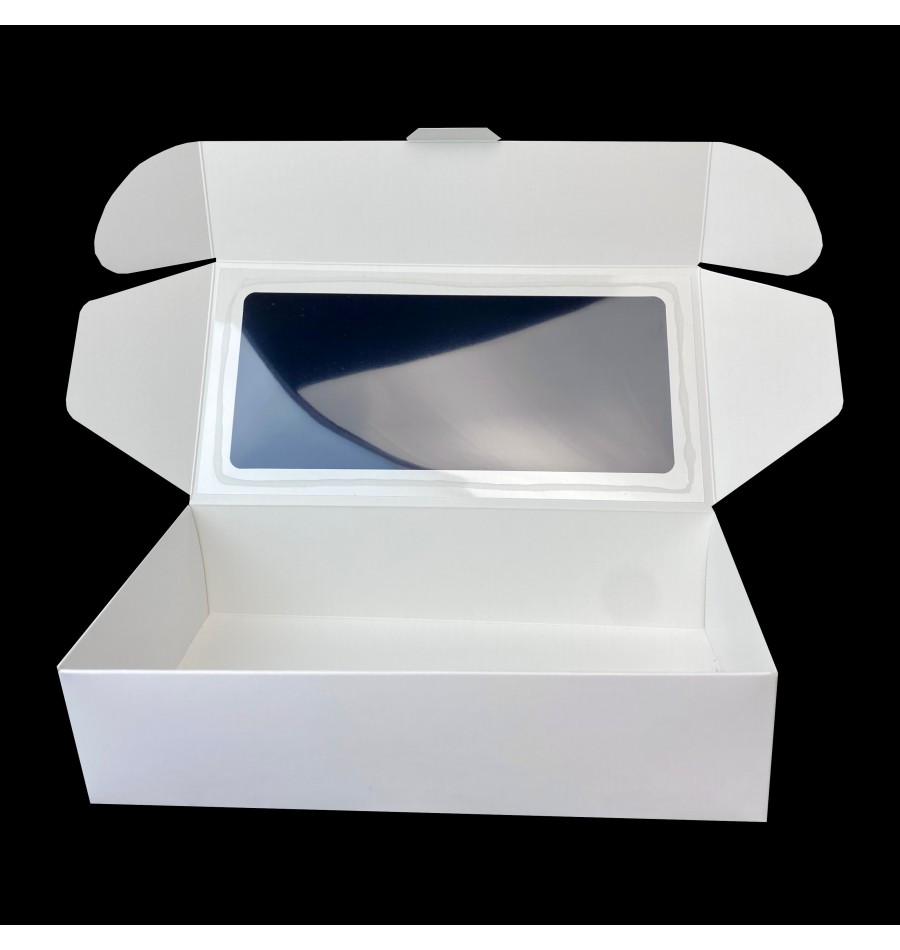Eleganckie, jednoczęściowe opakowanie na wyroby cukiernicze wykonane z wysokiej jakości białego i sztywnego kartonu o gramaturze 300g/m2, co sprawia że pudełko jest stabilne, nie deformuje się i nie gniecie. Łatwe i szybkie składanie. Produkt wykonany z materiału posiadającego atest do kontaktu z żywnością. Pudełko znakomicie chroni wypieki przed uszkodzeniem, sprawia, że ich transport jest bezpieczny i stabilny. Boki pudełka są uchylne, co znacznie ułatwia umieszczenie ciasta wewnątrz opakowania.